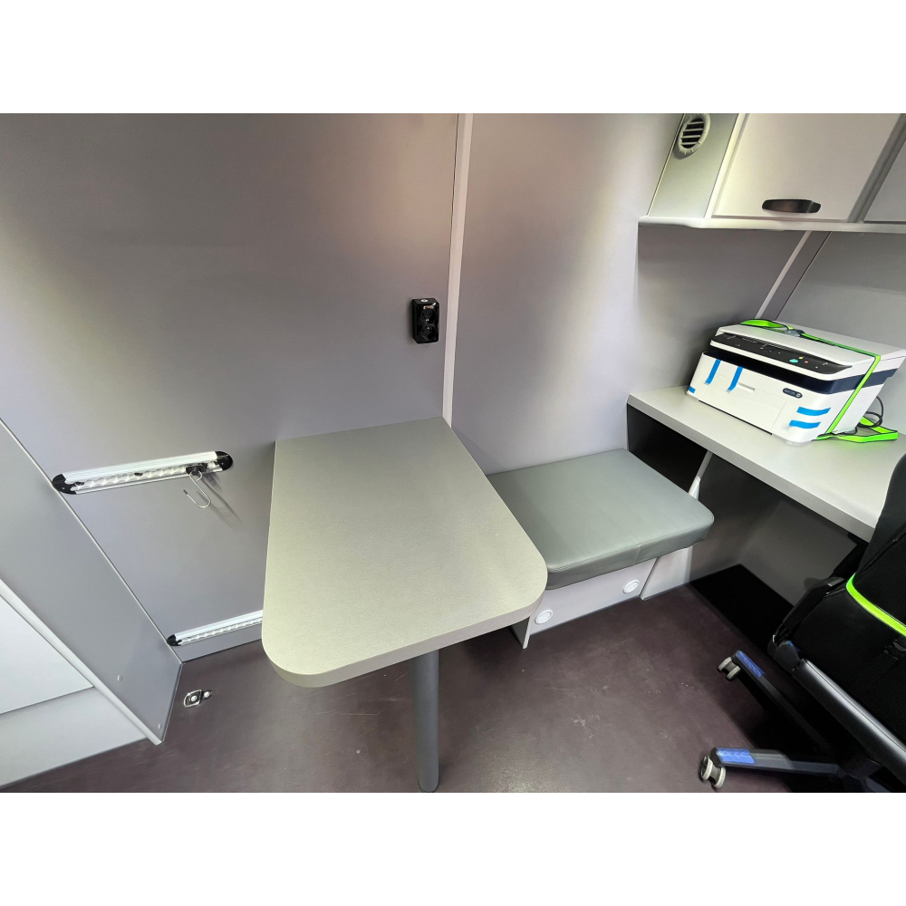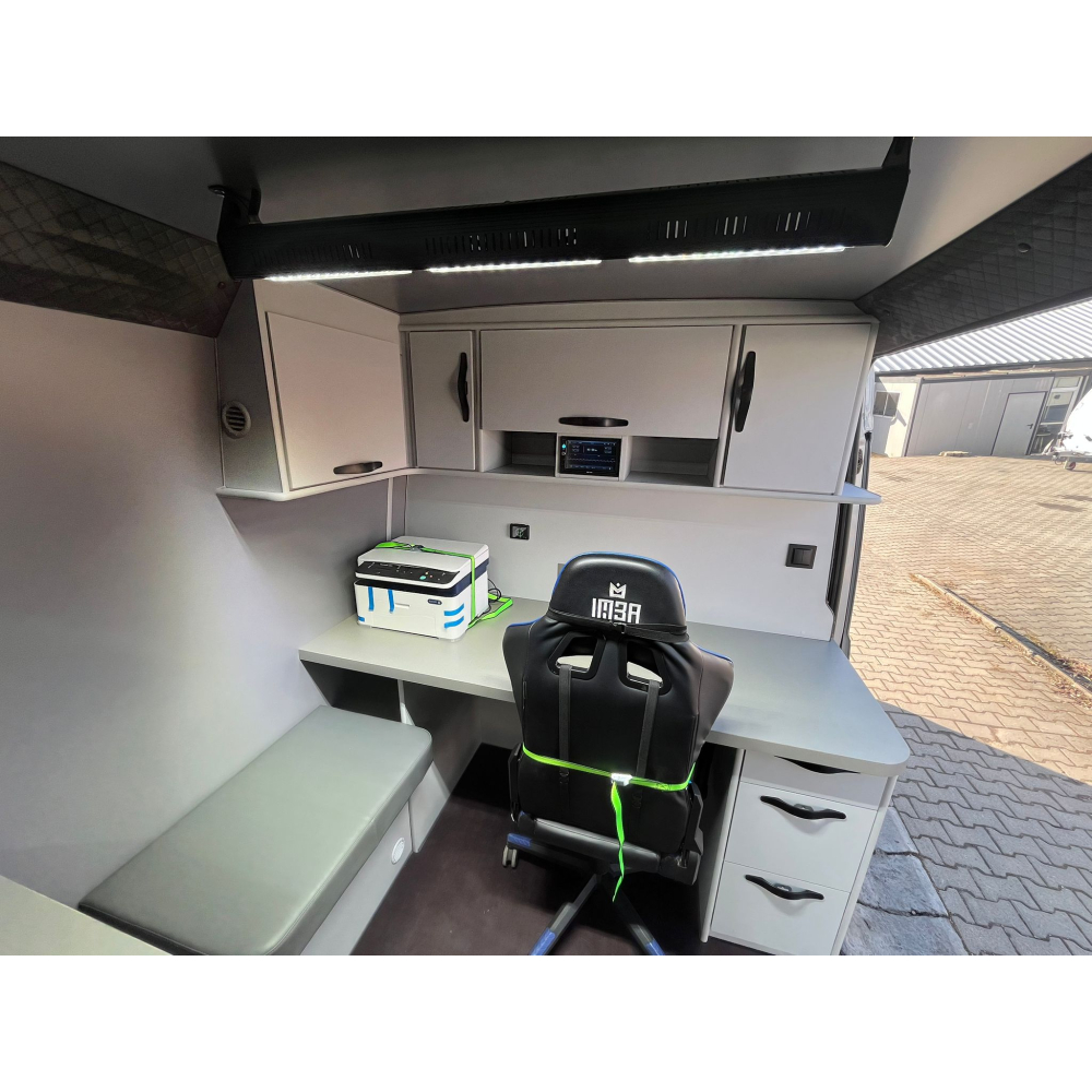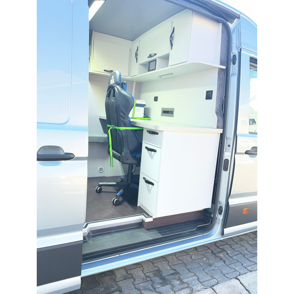 Zabudowa biurowa do busa VW Crafter wykonana według specyfikacji klienta
